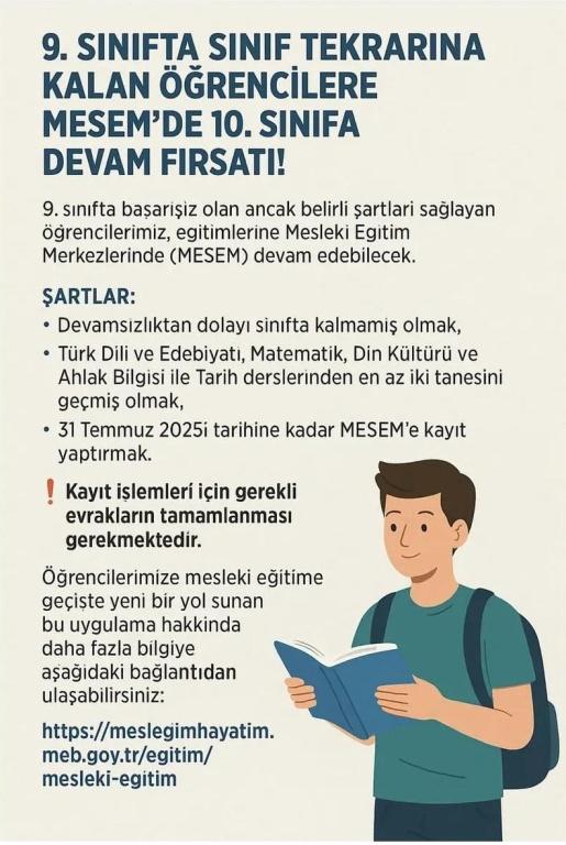 9. Sınıfta Sınıf Tekrarına Kalan Öğrenciler için MESEM'de 10. Sınıfa Kayıt Fırsatı – Son Günler 9. sınıfta başarısız olan ancak belirli şartları sağlayan öğrencilerimiz, eğitimlerine Meslekî Eğitim Merkezlerinde (MESEM) devam edebileceklerdir. Şartlar: Devamsızlıktan dolayı sınıfta kalmamış olmak, Türk Dili ve Edebiyatı, Matematik, Din Kültürü ve Ahlak Bilgisi ile Tarih derslerinden en az iki tanesini geçmiş olmak, 31 Temmuz 2025 tarihine kadar MESEM'e kayıt yaptırmak. ‼️ Kayıt işlemleri için gerekli evrakların eksiksiz olarak tamamlanması gerekmektedir. Meslekî eğitime geçişte öğrencilerimize yeni bir yol sunan bu uygulama hakkında daha fazla bilgiye aşağıdaki bağlantıdan ulaşabilirsiniz: Bağlantı Linki: https://meslegimhayatim.meb.gov.tr/egitim/mesleki-egitim